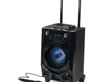 Includes Charging Cable plus Microphone and Cord has easy to use control panel, extended handle and wheels for easy moving. Features:
